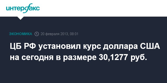 20 февраля. FINMARKET.RU - Официальный курс доллара США, установленный Центральным банком с 20 февраля 2013 года, составляет 30,1277 руб. По сравнению с предыдущим значением курс вырос на 0,19 коп.