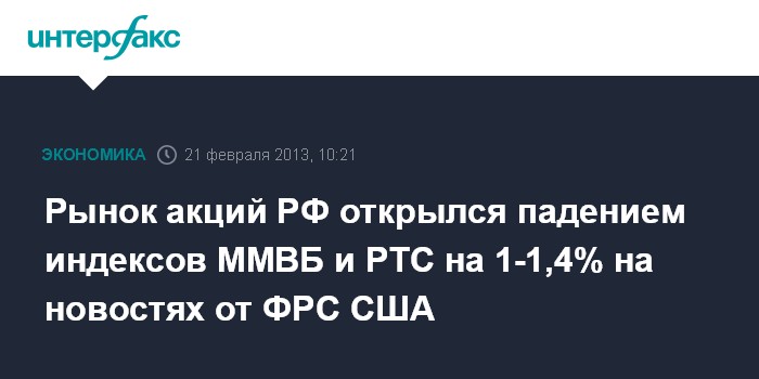 Москва. 21 февраля. INTERFAX.RU - Рынок акций РФ открылся в четверг падением цен blue chips вслед за мировыми площадками после публикации накануне протоколов январского заседания Федрезерва США, показавших увеличение числа сторонников сокращения стимулирующих мер экономики; индексы ММВБ и РТС за минуту торгов потеряли 1-1,4%, причем первый пробил поддержку 1500 пунктов.