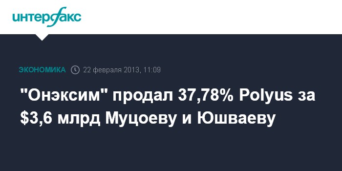 Москва. 22 февраля. INTERFAX.RU - "Онэксим" Михаила Прохорова продал за $3,6 млрд 37,78% акций Polyus Gold International Limited структурам депутата Госдумы Зелимхана Муцоева и бывшего совладельца "Вимм-Билль-Данна" Гавриила Юшваева, говорится в сообщении "Онэксима".