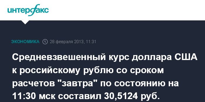 Средневзвешенный курс доллара США к российскому рублю со сроком расчетов "завтра" по состоянию на 11:30 мск составил 30,5124 руб.