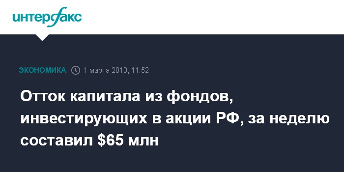 С начала 2013 года по 27 февраля общий объем оттока капитала из фондов, инвестирующих в акции РФ, составил $212 млн.