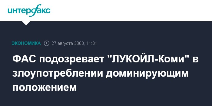Москва. 27 августа. INTERFAX.RU - Управление Федеральной антимонопольной службы России по республике Коми 18 августа 2008 года возбудило дело в отношении ООО "ЛУКОЙЛ-Коми" (дочерняя компания HК "ЛУКОЙЛ") по признакам нарушения закона "О защите конкуренции", говорится в сообщении пресс-службы ФАС России. Речь идет о нарушении ст.10 ФЗ "О защите конкуренции" - злоупотребление доминирующим положением на товарном рынке.