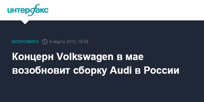 Женева. 6 марта. INTERFAX.RU - Германский концерн Volkswagen, который в настоящее время выпускает на мощностях в Калуге и Нижнем Новгороде автомобили под марками Volkswagen и Skoda, в мае 2013 г. намерен возобновить сборку автомобилей Audi в России, сообщил журналистам представитель российского подразделения VW.