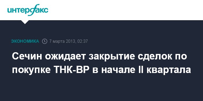 Хьюстон. 7 марта. ИНТЕРФАКС-АНИ - Президент "Роснефти" Игорь Сечин ожидает, что закрытие сделок по покупке всей ТНК-BP завершится в начале второго квартала.