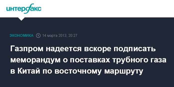 Телеканал приводит цитату зампреда правления "Газпрома" Александра Медведева: "Будет подписан меморандум о поставках трубного газа по восточному коридору, где будут определены основные параметры, которые откроют дорогу к согласованию цены. Я думаю, что нет никакого сомнения, что этот меморандум будет подписан", - сказал он.