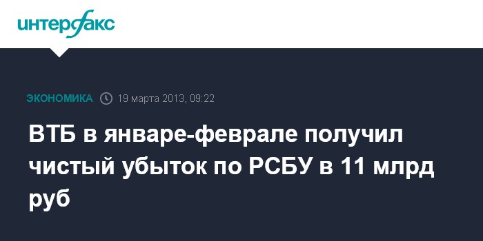 Москва. 19 марта. INTERFAX.RU - Чистый убыток банка ВТБ по РСБУ в январе-феврале 2013 года составил 11,058 млрд рублей, следует из отчетности банка, опубликованной на сайте ЦБ России.