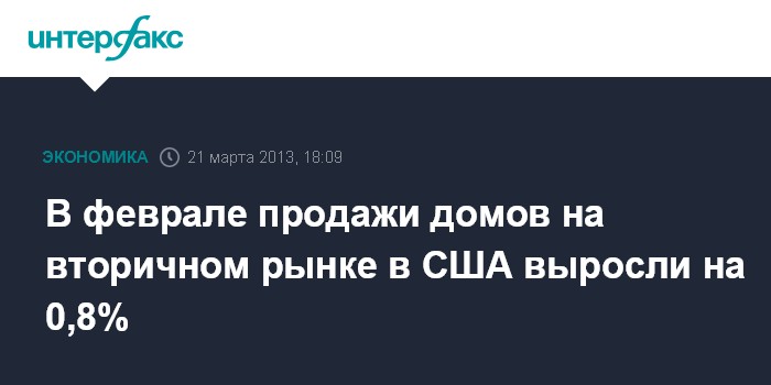 21 марта. FINMARKET.RU - В феврале продажи домов на вторичном рынке жилья в США выросли на 0,8% по сравнению с январем - до 4,98 млн домов в годовом исчислении, говорится в отчете Национальной ассоциации риэлтеров. Это является максимальным показателем с ноября 2009 года.
