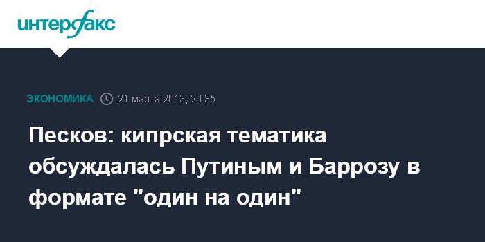 "Что касается кипрской тематики, то она обсуждалась отдельно между Путиным и Баррозу в формате "один на один", - сказал Песков журналистам по окончании встречи.