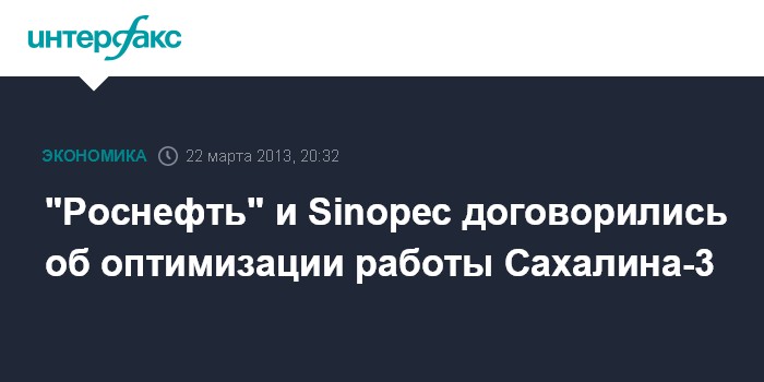 Москва. 22 марта. ИНТЕРФАКС-АГИ - "Роснефть" и китайская Sinopec договорились об оптимизации работы на проекте Сахалин-3, сообщил журналистам глава российской компании Игорь Сечин.