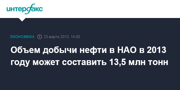 Нарьян-Мар. 23 марта. INTERFAX.RU - Прогнозируемый объем добычи нефти на территории Ненецкого автономного округа (НАО) в 2013 году может составить порядка 13,5 млн тонн, сообщили "Интерфаксу" в окружном управлении природных ресурсов и экологии.