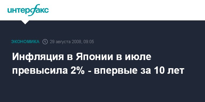 Москва. 29 августа. INTERFAX.RU - Уровень инфляции в Японии в июле впервые за 10 лет превысил 2% на фоне роста стоимости топлива и продуктов питания, сообщило агентство Bloomberg со ссылкой на официальные данные статистического бюро страны.