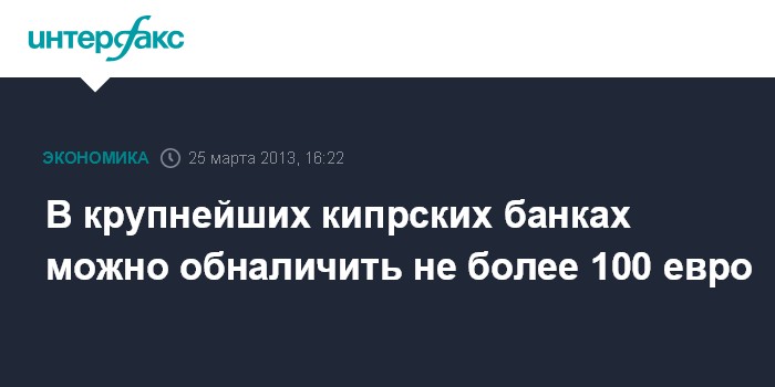 Москва. 25 марта. INTERFAX.RU - Два крупнейших кипрских банка - Bank of Cyprus и Popular Bank - ввели лимит в 100 евро на обналичивание денег в банкоматах, пишет газета Cyprus Mail. Соответствующее решение было принято в воскресенье Центральным банком Кипра, пишет издание.