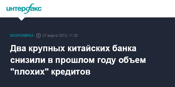 27 марта. FINMARKET.RU - Доли "плохих" долгов в общем объеме кредитов, выданных двумя крупными китайскими банками - Agricultural Bank of China Ltd. и Bank of China Ltd. - в 2012 году снизились.