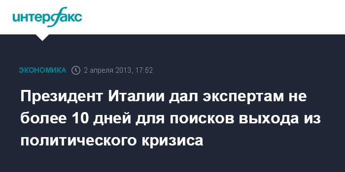 Рим. 2 апреля. INTERFAX.RU - Президент Италии Джорджо Наполитано во вторник заявил, что время работы двух экспертных групп, экстренно созданных им для вывода страны из политического кризиса, должно составить не более десяти дней. "Достаточное время для работы "мудрецов" - 8-10 дней", - сказал он.