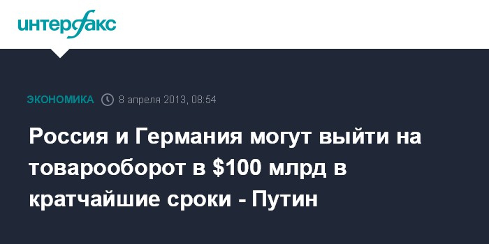 Выступая на церемонии открытия Ганноверской промышленной ярмарки, где Россия в этом году выступает страной-партнером, В.Путин напомнил, что двусторонний товарооборот в 2012 году составил рекордную цифру $74 млрд. "Убежден, что нам по силам выйти на рубеж в 100 млрд в самое ближайшее время", - подчеркнул президент.