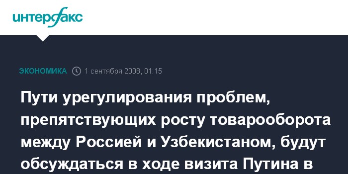 Москва. 1 сентября. ИНТЕРФАКС - Вопросам двустороннего торгово- экономического сотрудничества будет отведено ключевое место в ходе рабочего визита 1-2 сентября в Ташкент премьер-министра РФ Владимира Путина.