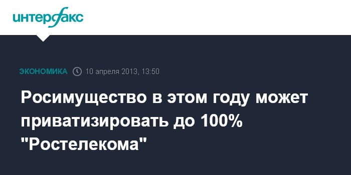 Москва. 10 апреля. INTERFAX.RU - Росимущество не исключает приватизации до 100% ОАО "Ростелеком", заявила журналистам руководитель ведомства Ольга Дергунова.
