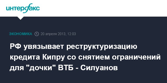 Вашингтон. 20 апреля. INTERFAX.RU - Россия намерена при ведении переговоров с Кипром по реструктуризации кредита настаивать на ответных шагах кипрской стороны по соблюдению российских интересов, в частности, связанных с работой кипрской "дочки" ВТБ - Русского коммерческого банка (РКБ), заявил журналистам министр финансов РФ Антон Силуанов.