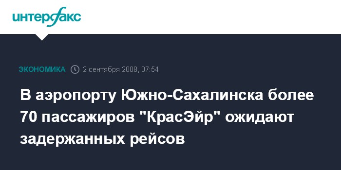Южно-Сахалинск. 2 сентября. INTERFAX.RU - В аэропорту Южно-Сахалинска по-прежнему продолжают откладываться рейсы "КрасЭйр". Их отправки с минувшей пятницы ожидают 75 пассажиров. В аэропорту города стоят 3 самолета "Ту-154" компании "КрасЭйр", сообщили агентству "Интерфакс-Дальний Восток" в пресс-службе аэропорта.