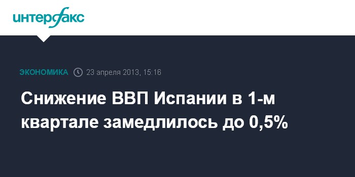 23 апреля. FINMARKET.RU - ВВП Испании в 1-м квартале 2013 года сократился на 0,5% по сравнению с предыдущими тремя месяцами, когда наблюдалось его падение на 0,8%, говорится в экономическом бюллетене Банка Испании. Рецессия в стране продолжается уже семь кварталов подряд.