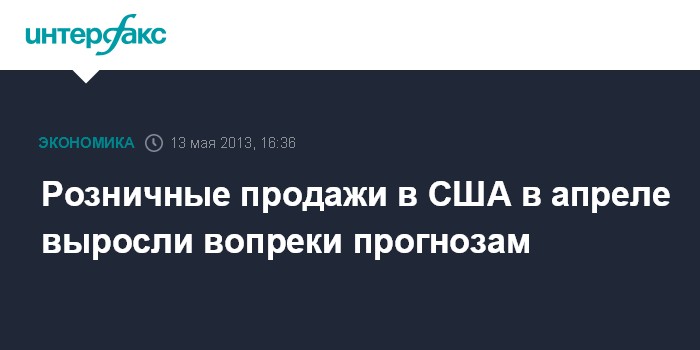 13 мая. FINMARKET.RU - Розничные продажи в США в апреле 2013 года выросли на 0,1% по сравнению с предыдущим месяцем, свидетельствуют данные министерства торговли страны.