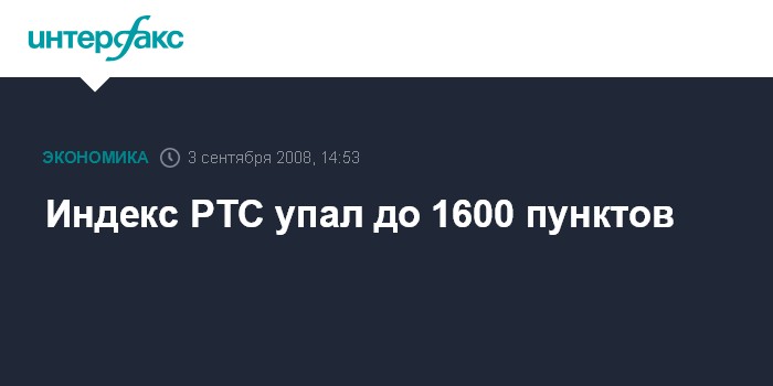 Москва. 3 сентября. INTERFAX.RU - Индекс РТС, один из основных российских фондовых индикаторов, в среду скатился до отметки 1600 пунктов на фоне падения всех blue chips на негативном внешнем фоне (снижаются мировые фондовые площадки и дешевеет нефть).