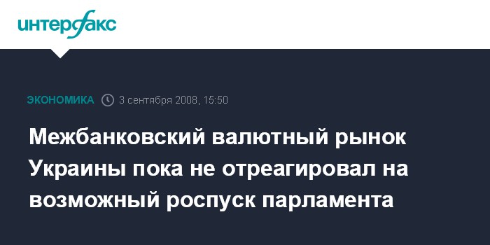 Москва. 3 сентября. INTERFAX.RU - Межбанковский валютный рынок Украины пока не отреагировал на заявление президента Украины Виктора Ющенко о вероятности роспуска парламента страны, сообщили дилеры украинских банков агентству "Интерфакс-Украина".