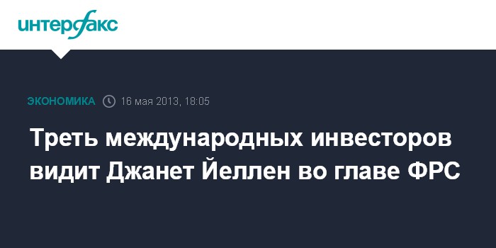 Нью-Йорк/Лондон. 16 мая. INTERFAX.RU - Около трети (34%) международных инвесторов, аналитиков и трейдеров, участвовавших в опросе агентства Bloomberg, считают заместителя председателя совета управляющих Федеральной резервной системы (ФРС) Джанет Йеллен наиболее вероятным кандидатом на должность главы американского ЦБ после ожидаемого ухода с нее Бена Бернанке.