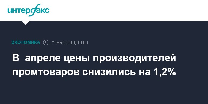 21 мая. FINMARKET.RU - В апреле 2013 года цены производителей промышленных товаров снизились на 1,2% после роста на 0,5% в марте и на 0,8% в феврале, свидетельствуют предварительные данные Федеральной службы госстатистики (Росстата). До февраля цены промпроизводителей снижались на протяжении 4-х месяцев