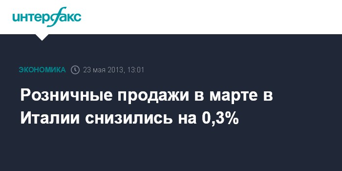 23 мая. FINMARKET.RU - В марте 2013 года объем розничных продаж в Италии упал на 0,3% по сравнению с предыдущим месяцем, когда снижение продаж составило 0,2%, свидетельствуют данные государственного статического управления Италии Istat.