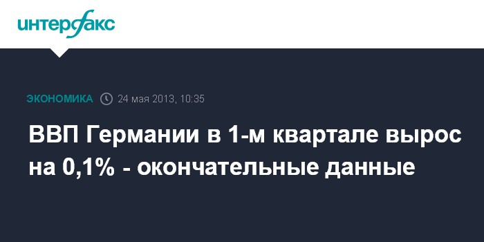 24 мая. FINMARKET.RU - ВВП Германии вырос в первом квартале 2013 года на 0,1% по сравнению с предыдущим кварталом, свидетельствуют окончательные данные Федерального статистического агентства ФРГ (Destatis).