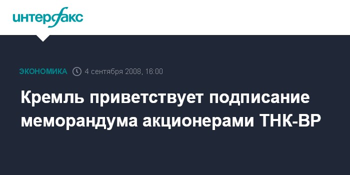 Москва. 4 сентября. INTERFAX.RU - В Кремле приветствовали подписание меморандума о взаимопонимании между акционерами компании ТНК-ВР.