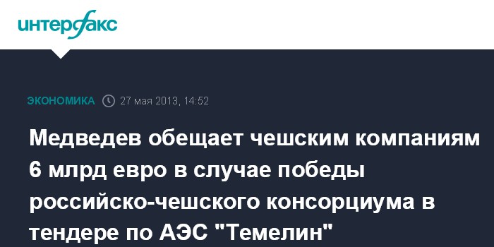 "Российско-чешский консорциум с удовольствием примет участие в международном тендере на строительство новых блоков на АЭС "Темелин". Если мы сможем доказать солидность нашей позиции, то чешские компании получат очень значительные заказы на сумму до 6 миллиардов евро", - заявил Медведев по итогам встречи с премьер-министром Чехии Петром Нечасом.