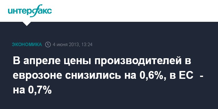 4 июня. FINMARKET.RU - В апреле 2013 года цены производителей в еврозоне (индекс PPI) снизились на 0,6% по сравнению с предыдущим месяцем, когда их снижение составило 0,2%, свидетельствуют данные Евростата. В годовом выражении цены в апреле сократились на 0,2% после роста на 0,6% в марте.