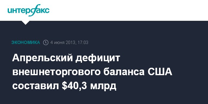 4 июня. FINMARKET.RU - Дефицит внешнеторгового баланса США в апреле 2013 года вырос на 8,5% - до $40,3 млрд, свидетельствует обнародованный во вторник отчет министерства торговли страны.