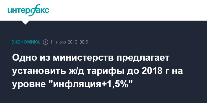 Москва. 11 июня. INTERFAX.RU - Одно из профильных министерств предлагает установить долгосрочные железнодорожные тарифы до 2018 года на уровне "инфляция + 1,5%", пишет во вторник газета "Ведомости" со ссылкой на источники, знакомые с материалами этого ведомства (не называя его).