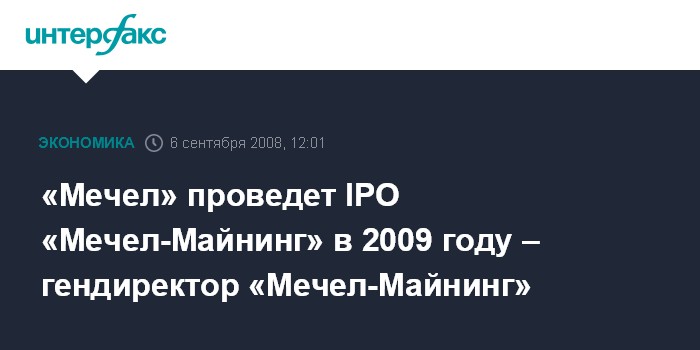 Москва. 6 сентября. INTERFAX.RU - Группа "Мечел" намерена провести IPO своих горнодобывающих активов, консолидированных в ОАО "Мечел-Майнинг", в 2009 году, заявил генеральный директор "Мечел-Майнинга" Игорь Хафизов в кулурах Якутского экономического форума.