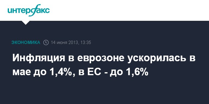 14 июня. FINMARKET.RU - Инфляция в мае 2013 года в еврозоне в годовом исчислении ускорилась до 1,4% после 1,2% в апреле, свидетельствуют окончательные данные Статистического управления Европейского союза. Ранее инфляции в еврозоне замедлялась в течение четверех месяцев подряд. Причем апрельский показатель годовой инфляции был самым низким с февраля 2010 года.