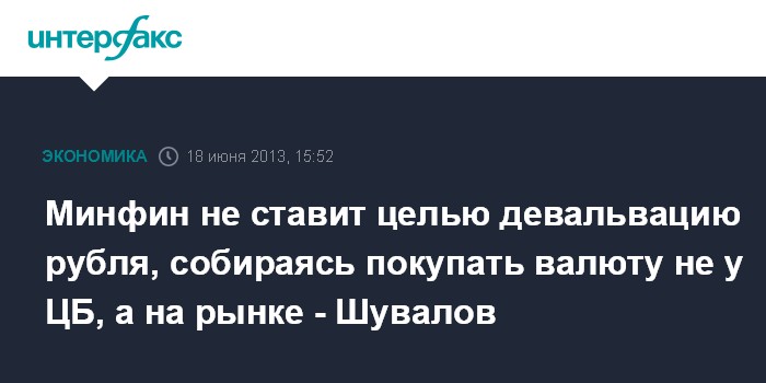 "Будет больше ликвидности, и не будет происходить укрепление. Это согласованная между Минфином и Центробанком политика, а девальвация, это когда у вас торговое сальдо резко меняется, интервенций банка (ЦБ РФ) нет, и курс поплыл. У нас вообще этой ситуации нет, у нас, как вы знаете, сальдо по-прежнему положительное", - сказал И.Шувалов, добавив, что решение о том, что Минфин будет покупать валюту на рынке, было принято еще несколько месяцев назад.