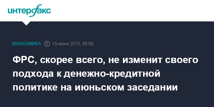19 июня. FINMARKET.RU - Федеральная резервная система США (ФРС), скорее всего, не изменит своего подхода к денежно-кредитной политике на июньском заседании. Большинство экспертов, опрошенных агентством Bloomberg, считает, что Федрезерв сохранит и уровень базовой процентной ставки, и объемы выкупа активов в рамках программы количественного смягчения (QE).
