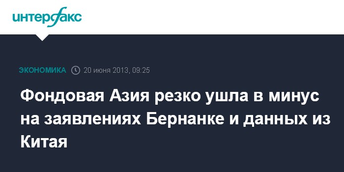 20 июня. FINMARKET.RU - В ходе сегодняшних торгов фондовые индексы Азиатско-Тихоокеанского региона снижаются значительными темпами, поскольку инвесторов обеспокоили заявления председателя Федеральной резервной системы (ФРС) Бена Бернанке о возможном начале свертывания стимулов позднее в этом году в случае дальнейшего укрепления американской экономики. Негативное влияние на рынок также оказывают предварительные данные о деловой активности в перерабатывающей промышленности Китая, отмечает Bloomberg.