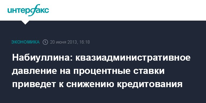 Москва. 20 июня. INTERFAX.RU - Влияние на банковские процентные ставки административными или квазиадминистративными методами приведет к снижению объемов кредитования, считает помощник президента РФ, будущая глава ЦБ РФ Эльвира Набиуллина.