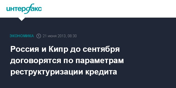 Санкт-Петербург. 21 июня. INTERFAX.RU - Россия и Кипр до сентября договорятся по параметрам реструктуризации кредита на 2,5 млрд евро, сообщил журналистам замминистра финансов РФ Антон Силуанов в кулуарах Петербургского международного экономического форума.