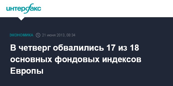 Сводный индекс крупнейших предприятий Европы Stoxx Europe 600 упал на 2,97% - до 283,68 пункта, что стало рекордным снижением с 21 ноября 2011 года. Индикатор потерял уже 8,7% с 22 мая, когда Б.Бернанке впервые объявил о том, что центробанк может сократить объем количественного стимулирования в случае существенных улучшений экономической ситуации.
