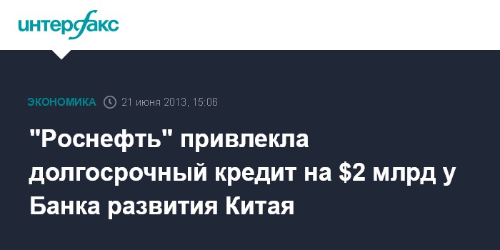 Санкт-Петербург. 21 июня. INTERFAX.RU - "Роснефть" привлекла долгосрочный банковский кредит в сумме $2 млрд у Банка развития Китая.