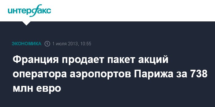 Париж. 1 июля. INTERFAX.RU - Правительство Франции намерено продать порядка 10% акций оператора парижских аэропортов Aeroports de Paris (ADP), рассчитывая привлечь за этот пакет 738 млн евро, сообщает агентство Bloomberg.