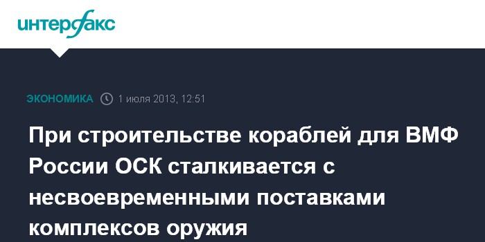 1 июля. FINMARKET.RU - При строительстве кораблей для ВМФ России предприятия-головники из Объединенной судостроительной корпорации (ОСК) нередко не могут выполнить свои обязательства по их передаче флоту из-за задержек с поставками комплексов оружия, заявил в понедельник журналистам в канун Международного военно-морского салона (МВМС-2013) директор департамента гособоронзаказа ОСК Анатолий Шлемов.