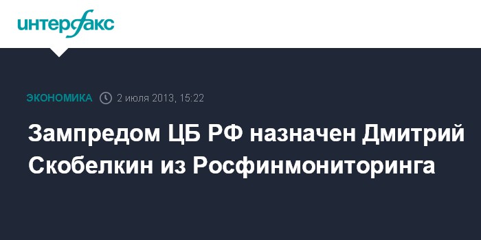 Москва. 2 июля. INTERFAX.RU - Заместителем председателя Банка России с 5 июля 2013 г. назначен Дмитрий Скобелкин, говорится в сообщении департамента внешних и общественных связей Банка России.