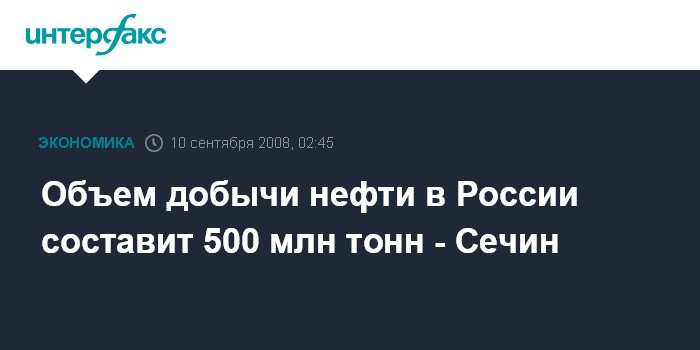 Объем добычи нефти в России составит 500 млн тонн - Сечин