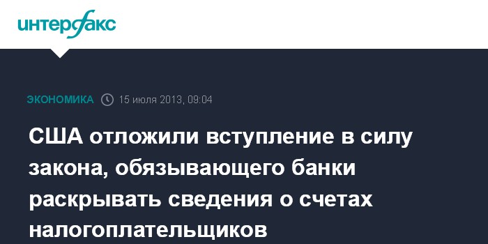 15 июля. FINMARKET.RU - США отложили на полгода, до 1 июля 2014 года вступление в силу закона, который обязывает все банки, в том числе российские, раскрывать американской налоговой службе (Internal Revenue Service) сведения о счетах американских налогоплательщиков и аффилированных с ними юридических лиц.
